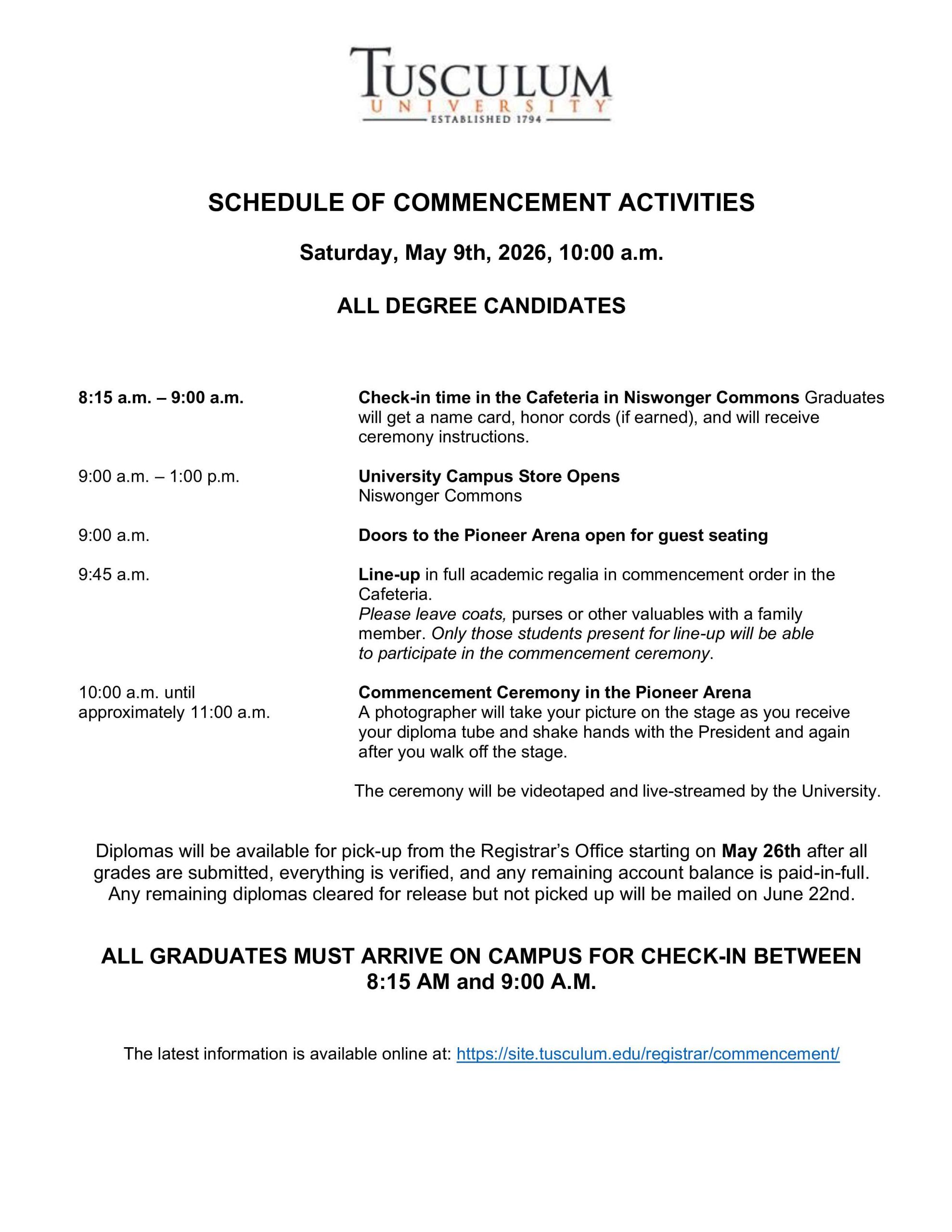 Also, please be aware that Tusculum University will no longer be holding commencement ceremonies in August. Those who will finish their programs in August will participate in either the May or December commencement ceremonies.